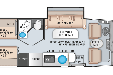 • Bed 3: A pull down single bunk up front.