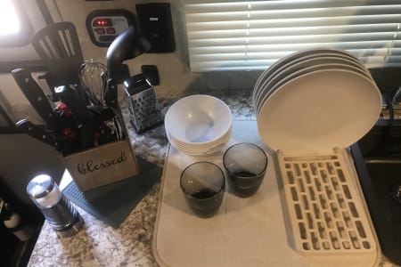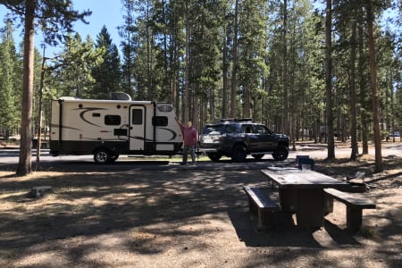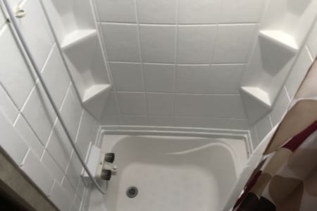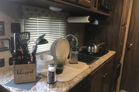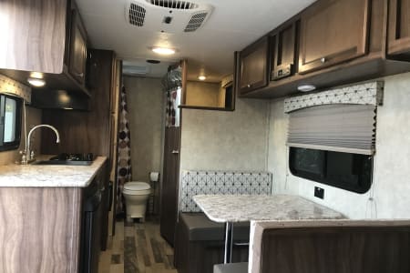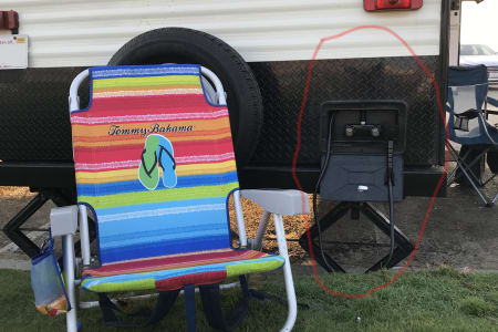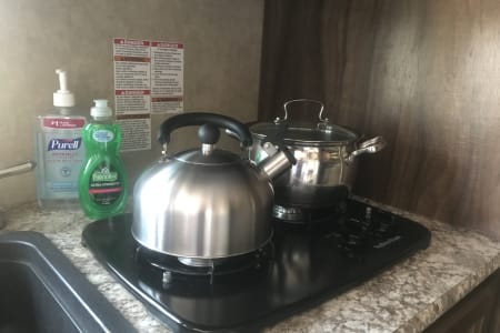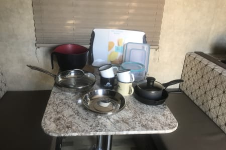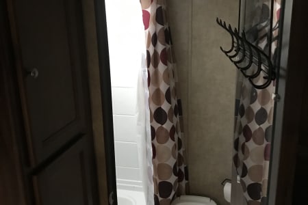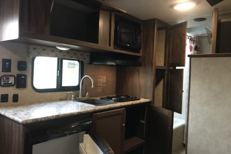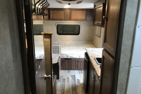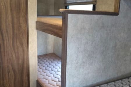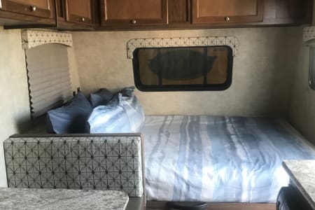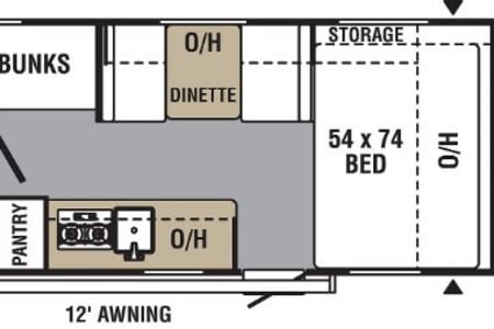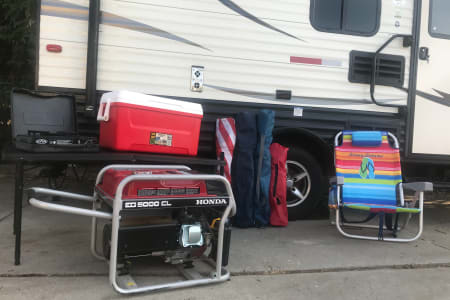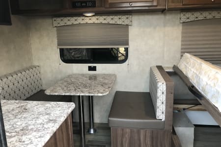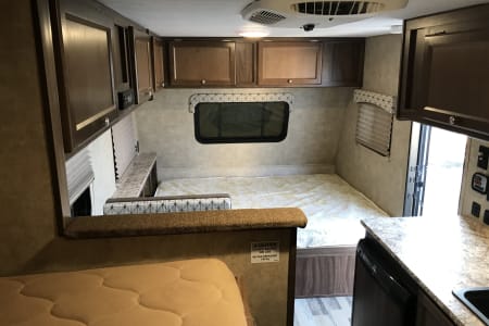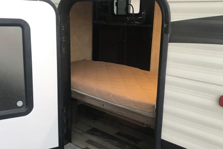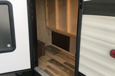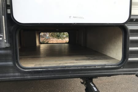 Tons of storage under the seats in the dinette area and under the queen bed that lifts to access the giant pass-through storage at the front. Awesome rear side door where the lower bunk bed lifts for extra space to store mountain bikes, firewood, outdoor chairs, or other needed camping things for quick access. The trailer equipped with an outdoor shower. If you like to camp at the beach, travel with kids, dogs, or other creatures who get their feet frequently dirty, you would appreciate this amazing innovation! Lots of spacious cabinets offer you even more comfort in storing for the whole family. Roof mount powerful A/C and fan with several speed options. Easy access points to water pumps, hoses, stereo, power converter.