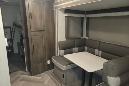 Brand new 2021 camper loaded with everything you need for a great family vacation! Just bring your clothes and toiletries! This camper offers privacy with a master queen bedroom and a private bunkroom that sleeps 3, and features an additional small dinette, perfect for the kids to play a game of cards. Additionally, the living area includes the versa lounge system that features a u shaped dinette and couch that can be converted to an L shaped lounger or a huge sleeping area for four adults, or pile on the little ones for a s'mores induced sleepover! The bathroom features a raised skylight that will accommodate taller guests comfortably. The kitchen offers everything you need to cook a home cooked meal, or you can use the Dutch oven to create campfire masterpieces for your family and friends. The fridge is huge and the kitchen offers plenty of storage to pack in all the food your family will need for at least a week.