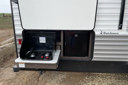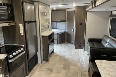 This is a great open floor plan with bunks in the rear for the kids. This camper is 30' long and has 1 slide so there is plenty of room. Dinette and booth also turn into beds. Bath tub for the little kids is great. Queen bed up front in a separate room for privacy. Electric awning with led lights. Half ton towable, I pull this with my suburban just fine. We include kitchen stuff with plates and silverware for cooking including cast iron for over the fire, coffee maker with K cup capability's, toaster towels, and bedding included, let me know age and sexes of kids and I'll try and get fun stuff for them. Chairs and mat for outside. Everything you need for a great get away. Hitch and sway bars are included with rental. Delivery is available if needed. Please ask before booking if delivery is needed. Pets permitted with a $50.00 non refundable fee.