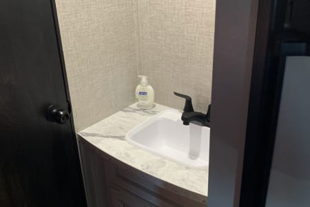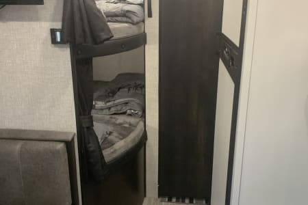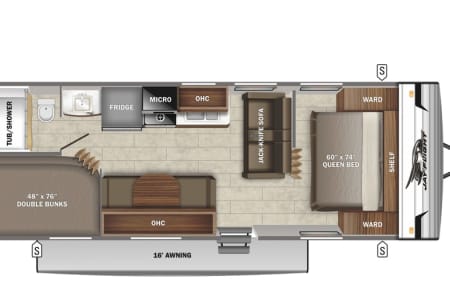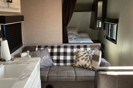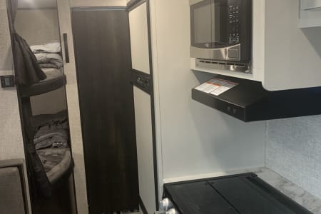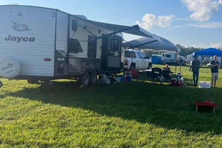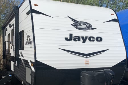 2022 Jayco features an indoor and outdoor shower, retractable awning with LED lighting, an enclosed underbelly, two televisions, a solar power package, and a modern farmhouse. Fully equipped with a queen-size bed, two bunk beds, stove, microwave, AC and heater, furnace, and water heater. Propane unit 40 lbs. Three outside storage compartments. Unloaded vehicle weight 4,580 lbs. Cargo carrying capacity of 1,420 lbs. Exterior height 9'10, exterior width 8', interior height 6'9, awning length 16'0.