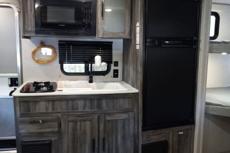 - The kitchen has a 2 pilot gas stove, microwave, sink, and refrigerator. There's also an electric griddle, coffee maker, and small air fryer located under the sink for use. I will also provide flatware.