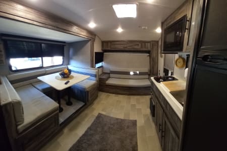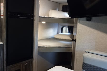 - Sleep up to 8 people, however I recommend no more than 6 to be completely comfortable but its up to you, there's 1 queen Murphy bed located in the living area, a separate bunk house for the kiddos which have full size mattresses, and the dinette also transforms to a full size bed. Please be sure to bring linen as it is not included.