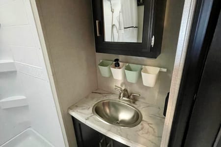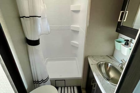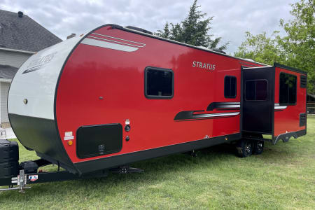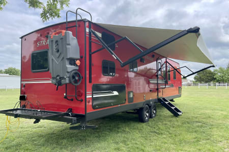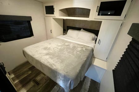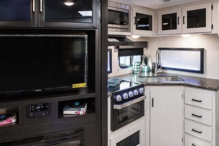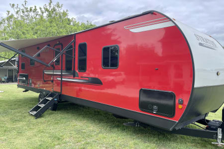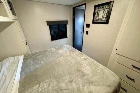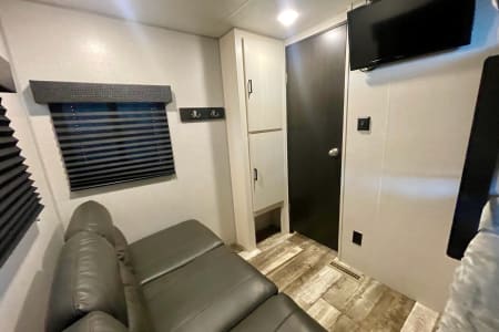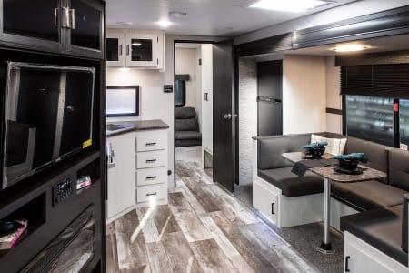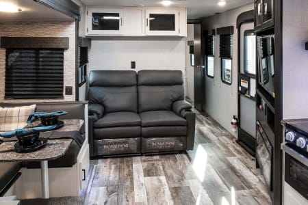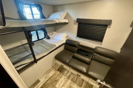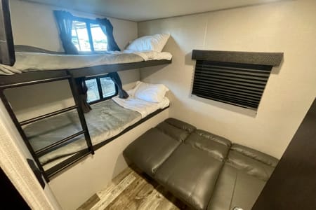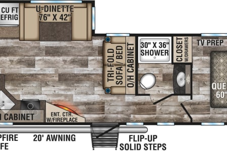 Load up the family for a fun trip in this travel trailer that includes a private bunkhouse for the kids and a front private bedroom for mom and dad. The kids will enjoy bunk beds, plus a 64" sofa where they can relax with a book, and the queen bed in the bedroom will provide a great night's rest. Head to the main living area where you'll find a U-shaped dinette within the slide-out for game night, meal times, and sleeping space. This model also includes a tri-fold sofa for even more overnight guests. Prepare all your meals on the three-burner cooktop or use the convenient microwave oven and the oversized shower will allow you to clean up each night before bed. In the morning you will love to cook breakfast on the campfire cafe and you can put out the 20' power awning for the day while the bacon is sizzling.