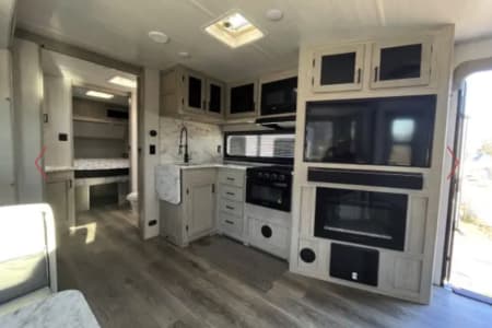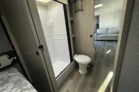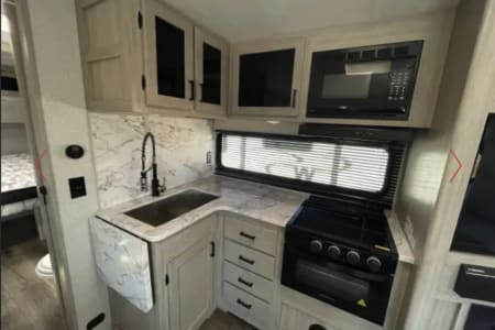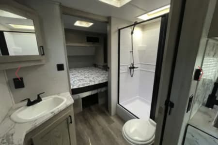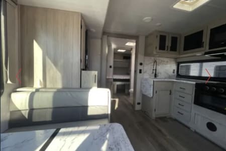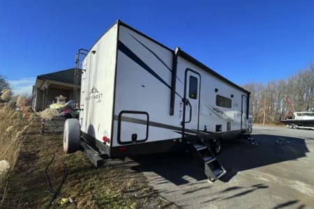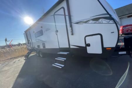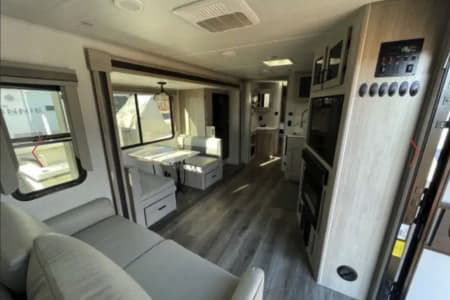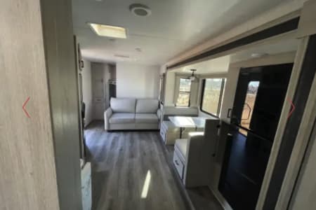 Great family camper or plenty of space for a couples getaway. Camper is complete with all utensils and amended needed to have a great camping experience. Camper will sleep up to 9 but 6 is very comfortable. Large slide allows for plenty of room in living area. Has private king bed room up front, with bunk beds in the back that the kids will love. Large crunch with table and couch also folds out into full size beds as well. Large awning will allow you fun outdoors no matter the conditions. Camper is equipped with chairs and outdoor/indoor cooking utensils. Outdoor kitchen with grill, sink and additional fridge. Included is pots and pans, silverware, plates, coffee pot, toaster, cups, and camper access. Nice and clean sheets, blankets, wash clothes, and blankets are ready for you. Toilet paper and paper towels also included. Really at the end of the day the only thing you will need is food and fun you will have taking this camper out. Finally has built in tvs inside that allow one of them to moved outside for tailgating etc. Book your getaway today!