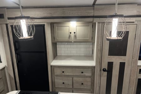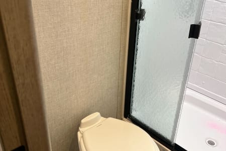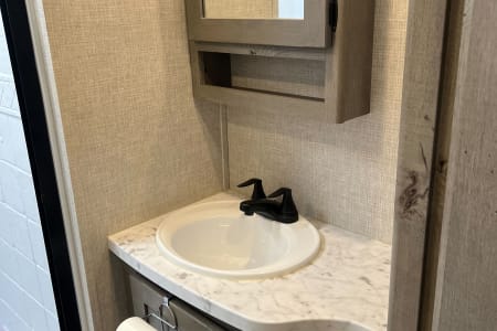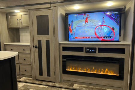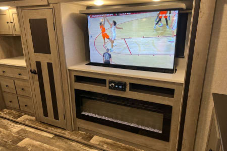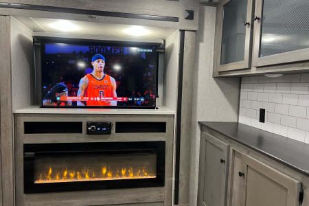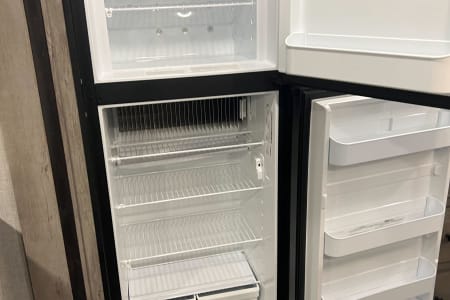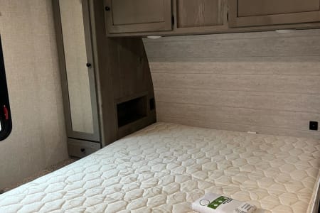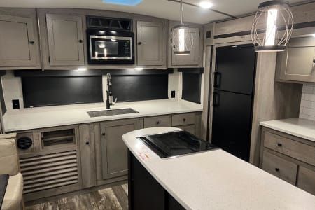 Step inside and be blown away by the spacious and comfortable living area. The RV is stocked with plush seating, a flat-screen TV, and a dining table perfect for dining or playing games with family and friends. The kitchen is fully equipped with all the conveniences of home, including a refrigerator, microwave, stove, and oven.