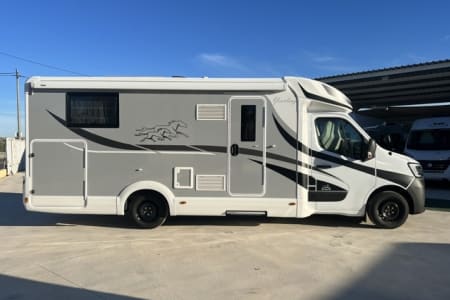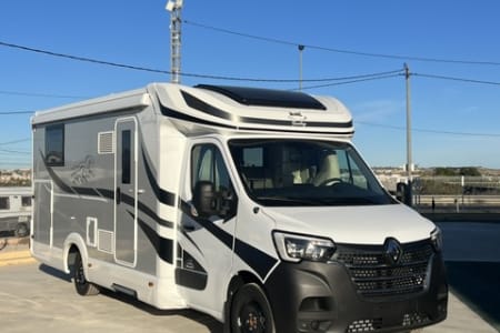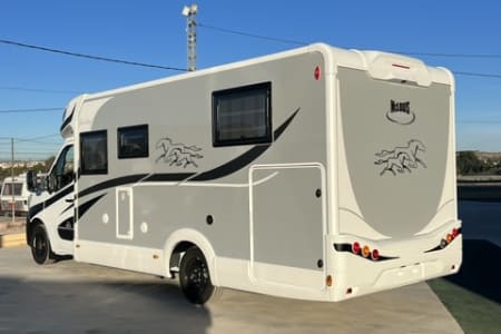 Autocaravana perfilada con cama isla trasera y abatible en el salón. Dispone un amplio garaje en el que caben bicicletas y todo lo necesario para tus vacaciones. Las medidas de las camas son: 140x190 y 130x190. Esta AC dispone de aire acondicionado en la cabina y en el habitáculo cuando el vehículo está parado. Dispone también de toldo exterior, TV, Dúo Control, equipo multimedia con retrocámara y enchufes USB para conectar los móviles.