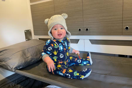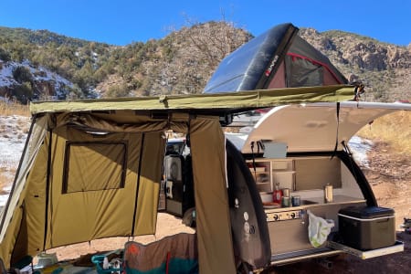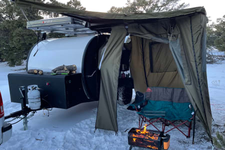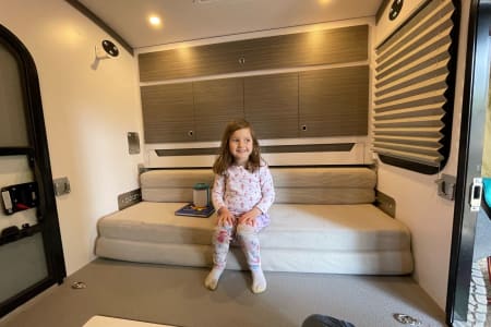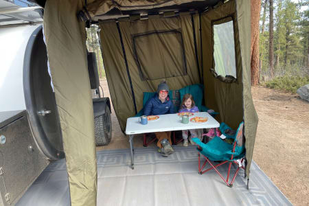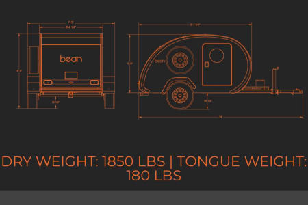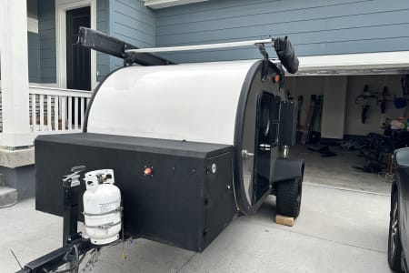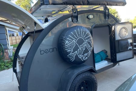 Our Magic Bean is a 2022 teardrop trailer camper. It features a queen sized bed, and a bunk for kiddos that stretches across the interior. This camper can sleep 2 adults comfortably. We sleep 2 adults, a 7 yo and a 5 yo in the main cabin. It has an exterior kitchenette with running water, an instant hot water heater/outdoor shower, a 2-burner propane stove, and a cooler. It is powered to accommodate a refrigerator if needed. Unlike other teardrops, the interior is spacious. The bed reorganizes to form a couch and a small table pops out from the floor.