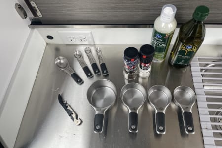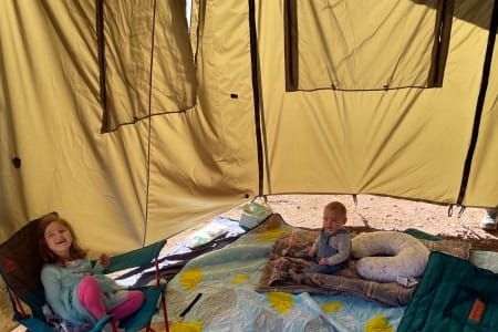 The exterior is equipped with a 23-Zero 180-degree awning to provide shade on those hot days. In addition, the awning can be attached with an annex that provides more protected space for eating, hanging out, or for cots for those extra-extra guests. We have recently added on a Joolca shower system for that oh-so-needed hot shower.