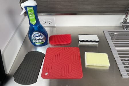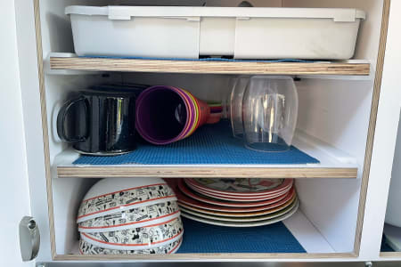 Storage is not an issue! There is plenty storage in large overhead cubbies, in drawers, and in pass-through cabinets to the kitchenette.