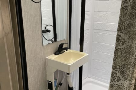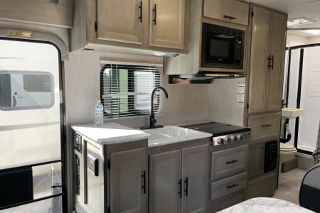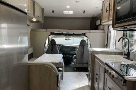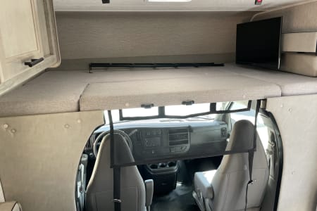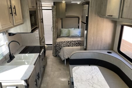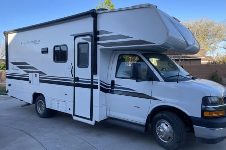 New RV, compact size for easy driving but roomy enough to sleep 6. Queen sized Murphy bed lifts up to give you a cargo area with cargo door. 110W Solar roof panel. Generator. Fully stocked: includes linens, dishes, cookware and bathroom supplies, camp chairs, flat screen TV with HDTV Digital Antenna for local channels and a DVD player. We offer flexible pick up and drop of times.