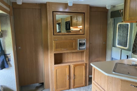 The fully-equipped kitchen will cook up your camping favorites including a fridge, microwave, stovetop, oven, and double sink. The kitchen is stocked with pots & pans, dishes, coffee mugs, coffee pot, baking sheet, muffin pan, pizza pan, serving utensils, and flatware.