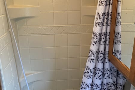 Bathroom is spacious with an additional exterior door. It has a shower/tub combo, sink, and toilet. RV safe toilet paper is provided.
