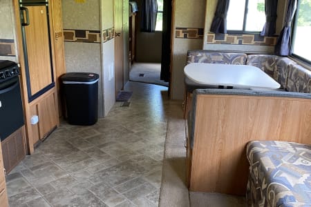 A U-shaped dinette seats 6, with additional seating on the couch. A Large TV/Entertainment center is in the living area.