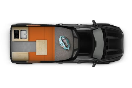 Équipé d’un campeur SpaceKap entièrement isolé, il propose un couchage confortable pour deux adultes et deux enfants. Le lit principal mesure 60 x 72 pouces (153 cm x 183 cm), tandis que le lit secondaire surélevé de 55 x 49 pouces (140 cm x 125 cm), avec dégagement réduit, est idéal pour les enfants.