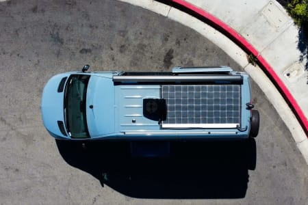 High-end features include an outdoor hot/cold shower, furnace/water heater system, water filter, 3-zone dimmable 12v LED strips, Lagun table mount, Arctic Tern awning windows, retractable awning, maple cabinetry, and sheep wool insulation. The van's console displays battery and clean water levels, ensuring convenience and sustainability.