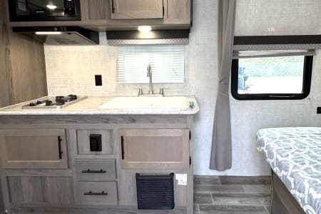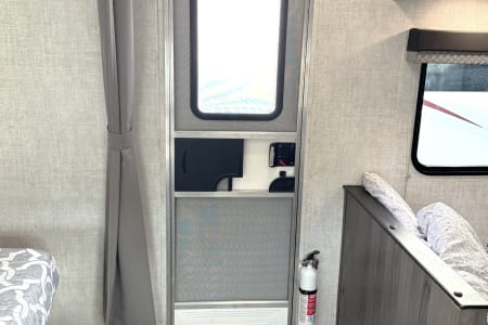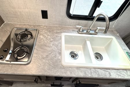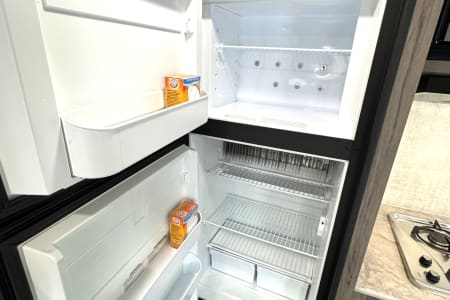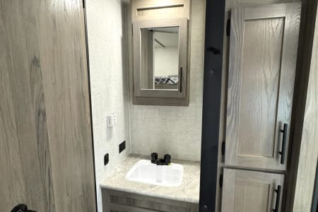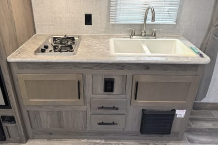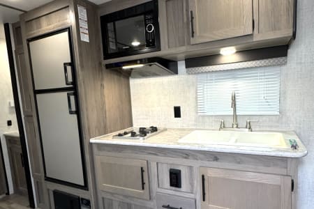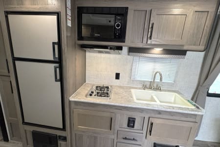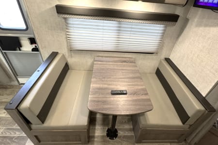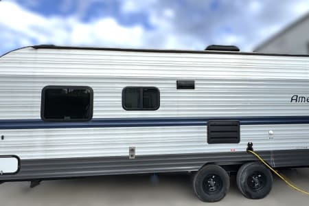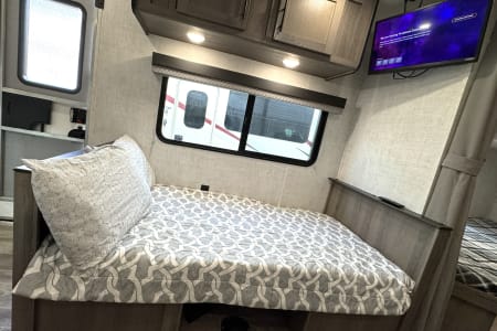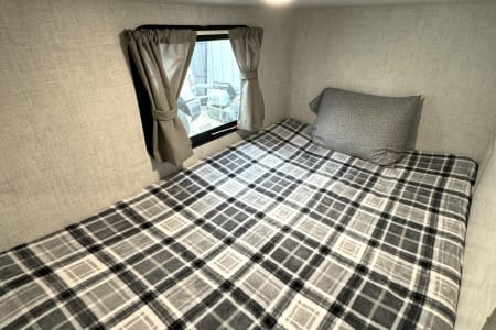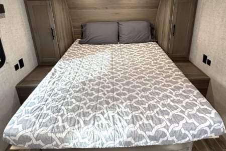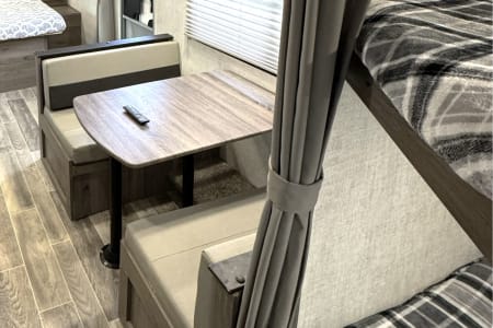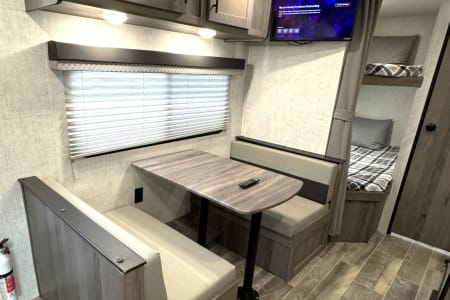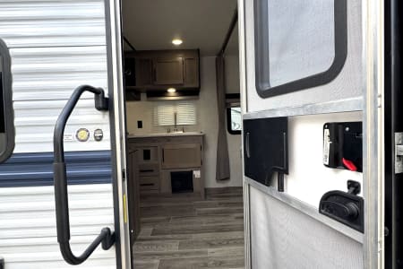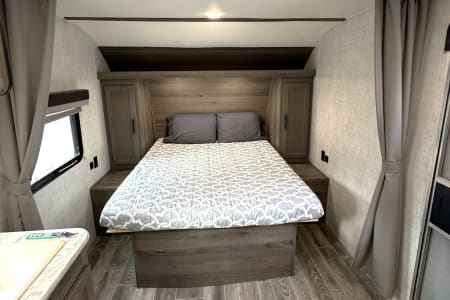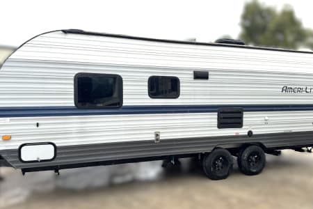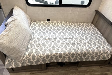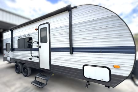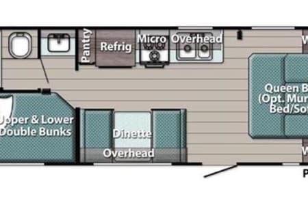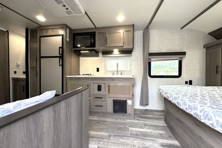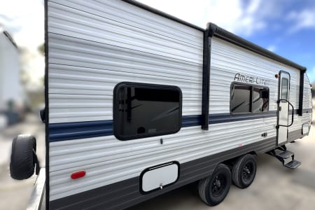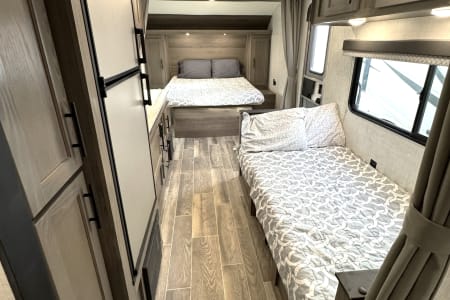 Great smaller unit that still sleeps a good-sized family of up to 8 people. At 27 feet long, this travel trailer will fit well in just about any space, but go inside and you will find one queen master bedroom, a set of double-sized bunks at the opposite end, a couch that converts to sleep, and a dinette that will also convert to sleep! Not too heavy with a GVW of 8,000 as well, so it should be good to be towed by any medium to larger truck.