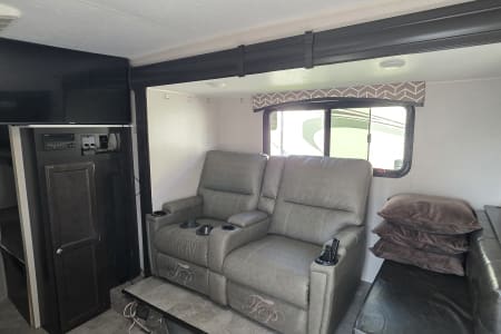This travel trailer features speakers inside and out with Bluetooth capability. If the weather is warm, there’s AC to blast cold air. There is an electric awning with LED lighting to keep you safe from the elements. With our delivery service, plan your family's next adventure and leave the worry of set up and break down to us. This trailer is just right!