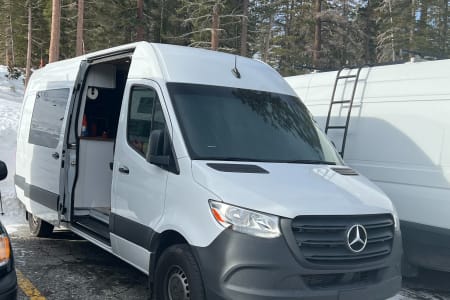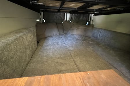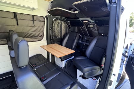 Our custom Sprinter Van conversion is the perfect adventure vehicle for a family of 4/5. The van comes equipped with a battery bank, inverter, and solar panels to be completely off-grid capable. No need to plug into shore power to run the refrigerator, lights, heater, and ceiling fan. While driving to your destination, you have the comfort and peace of mind using the OEM second-row bench seats equipped with 3 seatbelts. Once you arrive, there is plenty of sleeping room with our stacked 2-bed setup. If one Queen sized bed is sufficient, the upper bunk bed can be removed for a more open overhead space environment. The van has insulated walls, insulated window coverings, and a very efficient, thermostat-controlled diesel heater. Equipped with a 20 Gallon fresh water tank supplying fresh water to the kitchen faucet. 1 Burner range stove top. Cabinets and overhead storage. A private changing room/ additional storage area. Additional storage under the bed. The front driver and passenger seats swivel to face the bench seat. A dining table can be quickly setup for a family meal or game night.