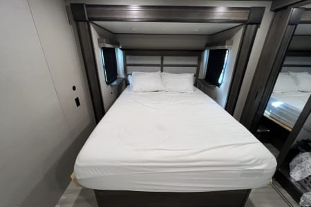 Book your glamping trip in our beautiful, top of the line RV. We have it fully stocked with anything you'll need during your trip- Dinnerware set with silverware for 8, pots + pans, cooking utensils, and a Keurig coffee maker (with 4 coffee mugs).