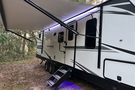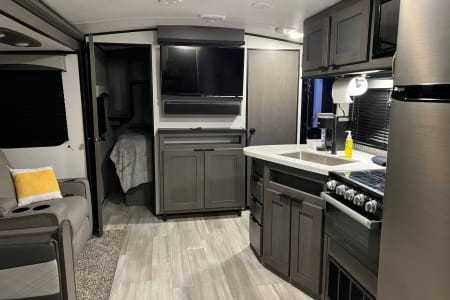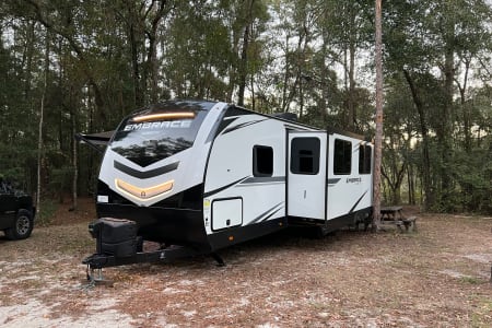 Come stay in your home away from home in our Like New 2021 Cruiser Embrace EL280 (33 ft, 1 slide out, 50 amp plug)! The main bedroom features a pillow top King bed you can sink into after a long day of camping or hiking!! Bring the kiddos, they can play all day in their separate Bunk Room! Bringing friends too? The dining set turns from game night to a comfortable full size bed! Don’t worry about packing kitchen items, your rental comes fully stocked with everything you’ll need from plates and silverware to a toaster and crock pot. It will come with small pots and pans of course that can be used either in the indoor or the outdoor kitchen! We supply sheets and a few starter towels as well! Pets welcome with $75 pet fee.