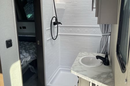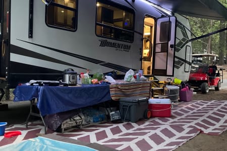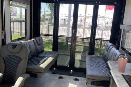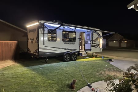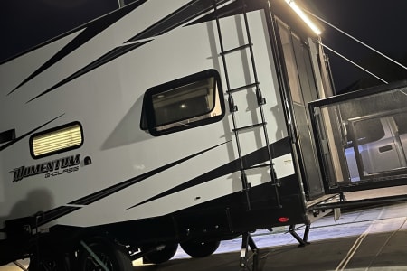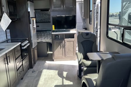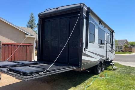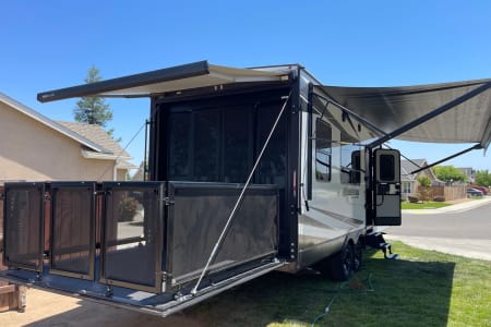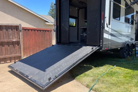 Toyhauler hitch pull trailer, captivating elegance for camping in style, rear loading ramp door converts into a relaxing enclosed patio with electronic awning w/ LED Lights. Large 8cft refrigerator, gas range, 30gl fuel station great for fueling up all your toys for a great camping experience, 2 smart tv’s and a Rockford stereo system that will keep you entertained, 15ft of garage space with mounted D-rings on the interior floor to secure your toys, master bedroom has a slide out feature housing a RV King bed, 2 couches convert into a queen bed with a electronic up and down sliding queen bed with removable ladder for access. Rear patio has closable patio gates that’s great for keeping kids clean after showers. Two movable Euro recliner chairs with removable table, chairs can be moved out onto the patio for added comfort