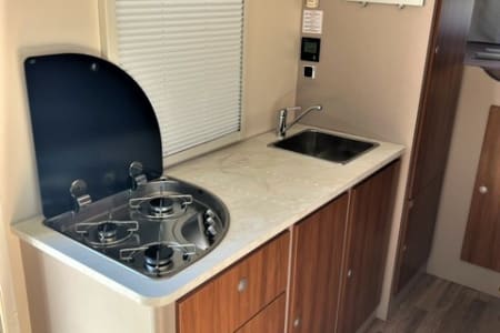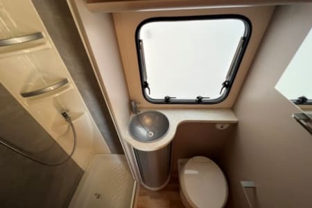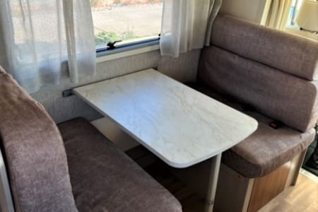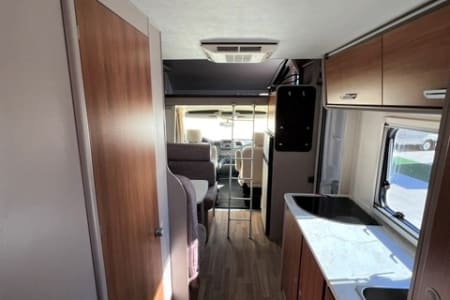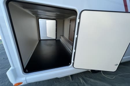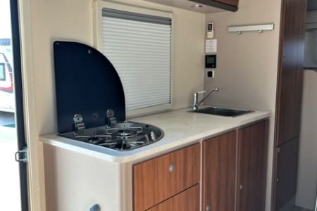 Capuchina de 6 plazas con dos grandes camas de matrimonio con medidas 140x210 y 150x210 y un enorme garaje que permite llevar incluso las bicicletas de todos los pasajeros. Las dos camas de matrimonio y el salón convertible en cama proporcionan habitabilidad para 6 pasajeros. El depósito de aguas limpias tiene una capacidad de 100 litros. Dispone de aire acondicionado en la cabina y en el habitáculo cuando el vehículo está parado. También tiene TV, Dúo Control, equipo multimedia con retrocámara, toldo exterior y enchufes USB para cargar móviles.