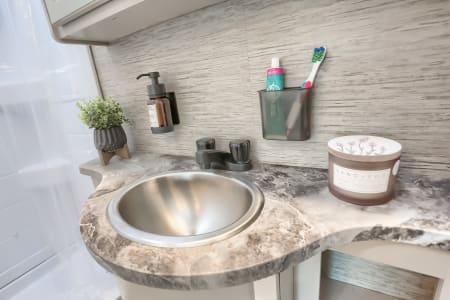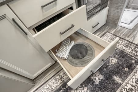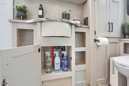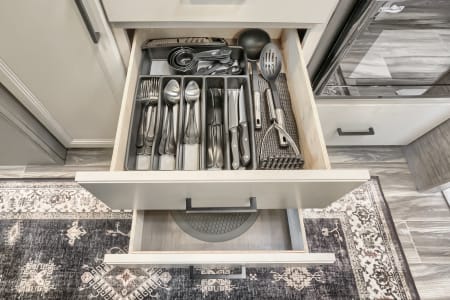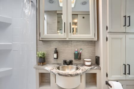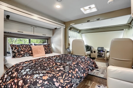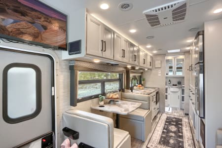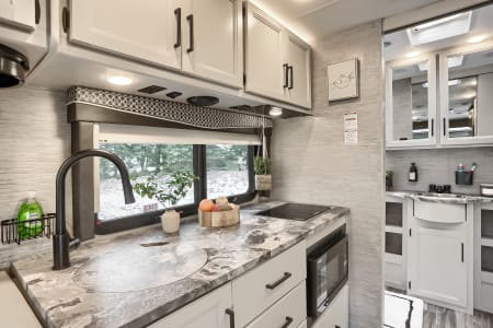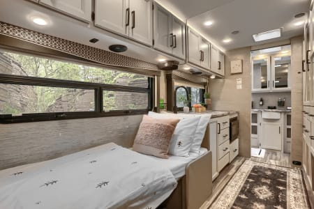 This Vegas Class A gas motorhome front cab is excellently appointed with a stow-away coffee table, reclining/swivel leatherette captain's chairs, a living area speaker tied to the dash radio, and a 10" touchscreen dash radio with Bluetooth, Android Auto, and Apple CarPlay! A single slide holds the sofa bed so that it isn't in your way as you walk back to the private full bathroom. The kitchen offers a countertop for more room to chop veggies and a TV to provide you with all the necessary entertainment.
