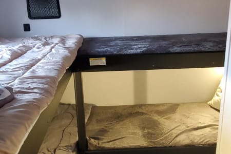 Adventures await. This is a luxury travel trailer that is beautifully equipped. One reason I purchased this particular brand of RV, is that it comes with solar, charger, inverter, and lithium batteries. If a park loses its 110 power, you can still use the inverter outlets. For those with a C- pap machine this is beautiful. This is a great family trailer with ample sleeping for up to 8 people. You will love the look and feel of this unit. It is truly a home away from home. We have included lots of extras to help enjoy a family vacation or a quick quiet getaway for families seeking adventure in the great outdoors.
