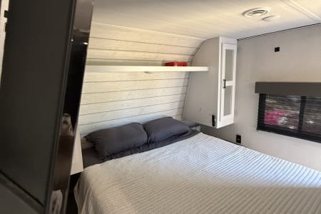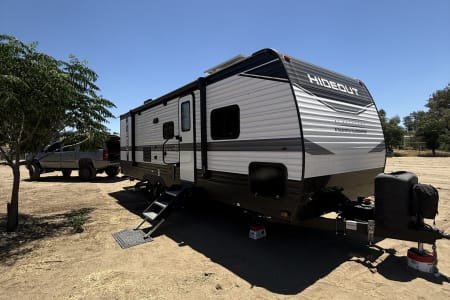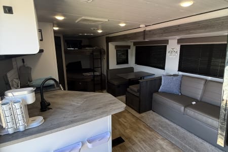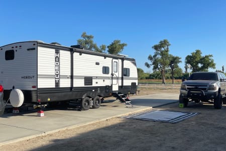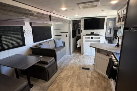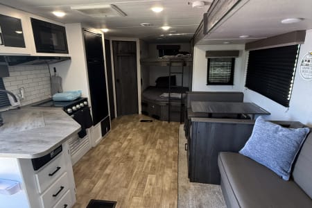 2023 Keystone Hideout! This trailer is perfect for family weekend getaways with full hook-ups and/or dry camping. This trailer is fully equipped with all things necessary for you to enjoy your camping experience with your family and friends. There is a private front bedroom with a queen bed mattress and 32 in smart tv. Main living space of trailer includes dinette table with bench style seating, that folds down for an added sleeping space, a sofa which also becomes a bed, and a 42 in smart tv with a soundbar. This trailer can sleep 8 comfortably but may sleep up to 10. The kitchen has an 8-cu ft fridge, 3 burner gas stove top, microwave, Keurig coffee maker, along with other select kitchen essentials. Featured outside the trailer is a power adjustable large awning with LED strip lighting, outdoor speakers, and an outdoor shower.