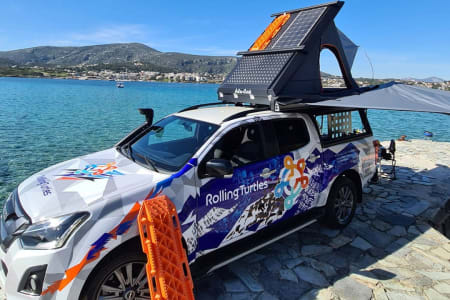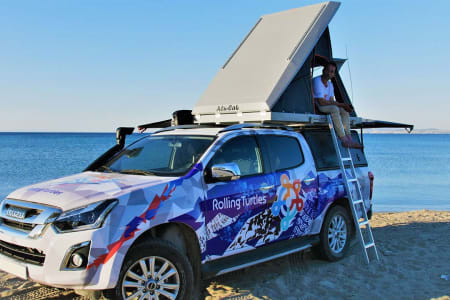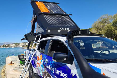 This best equipped 4×4 pickupcamper with A/T automatic transmission offers comfortable seating for 5 people and sleeping for 2 adults & 1 child in the stylish, comfortable & durable hard-shell integrated roof tent from ALUCAB (2,30 x 1,40 m). If necessary, 3 more adults can travel with the campervan and sleep in a separate camping tent next to the camper (tent available upon request), while enjoying all campers’ amenities like freezer, refrigerator, shower etc. This vehicle is special designed to visit the most remote places and stay off-grid for many days while enjoying the hidden Mediterranean unattached nature. The standard equipment of our 4×4 off-road truck campers comes from renowned top brands, specified as per below.