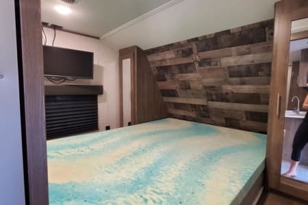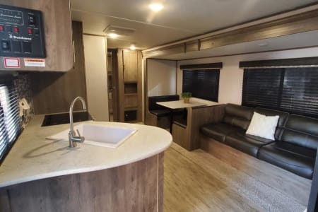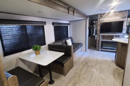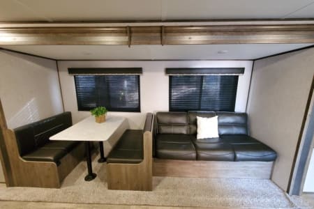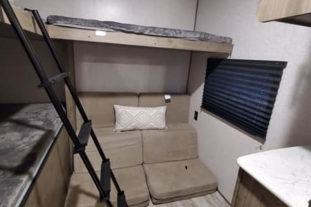 Private master suite with foam topped Queen bed. Dual entry. Separate bunkhouse sleeping quarters for up to 5 children in the back, it's own TV and entertainment area that quickly converts from den to bedroom with the included sofa cushions. Full size Dinette and sleeper sofa in main living area.