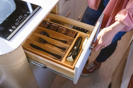 ⎷ Plates, bowls, cookware, silverware, kitchen knives