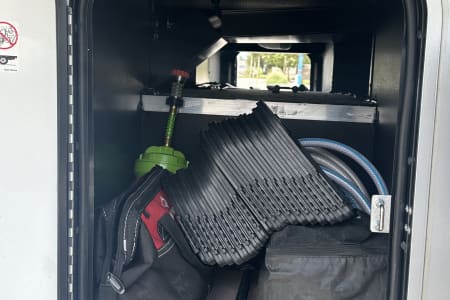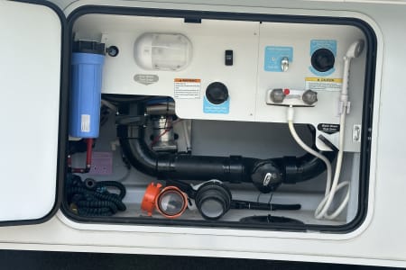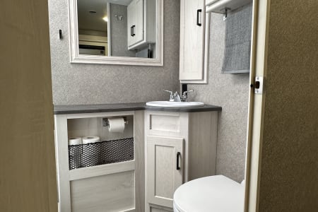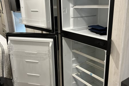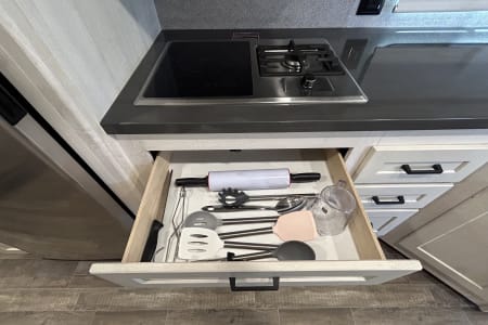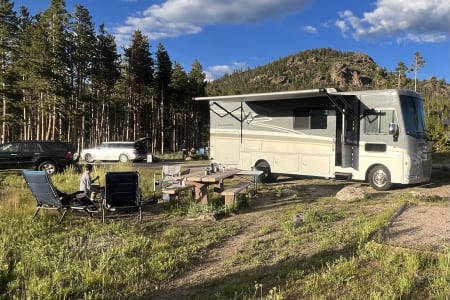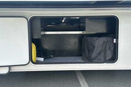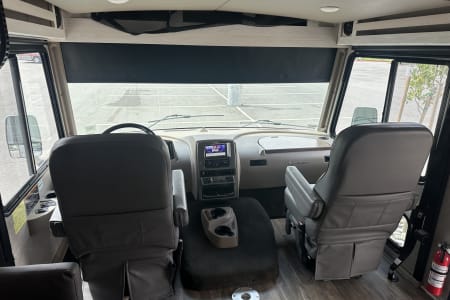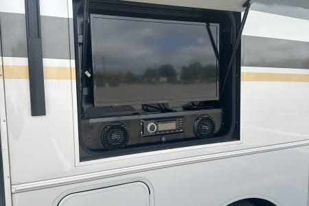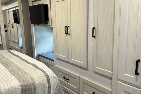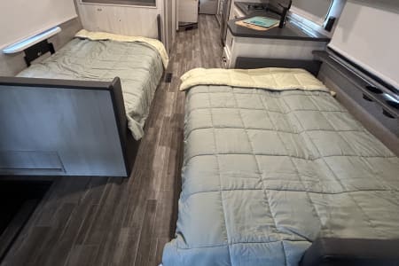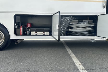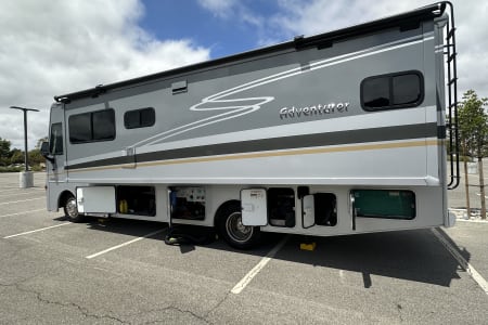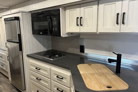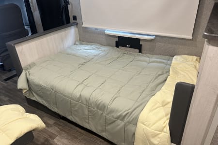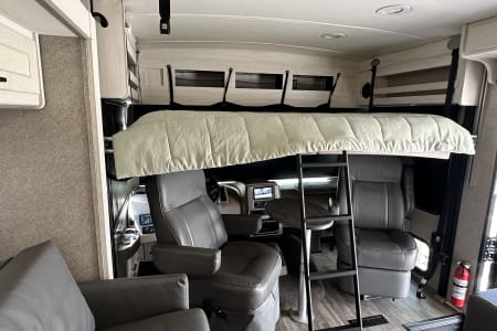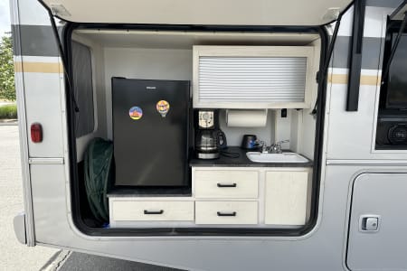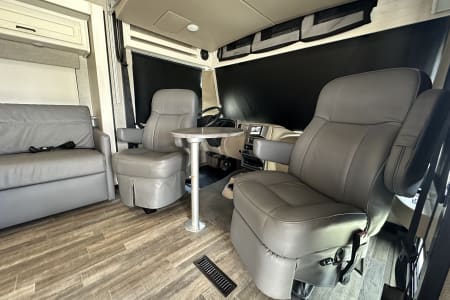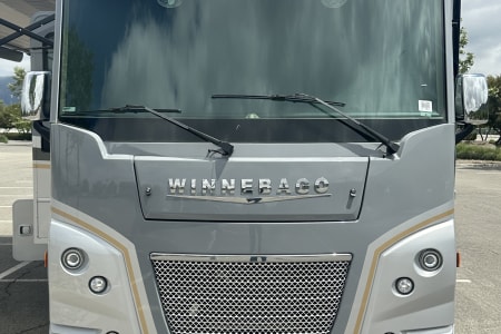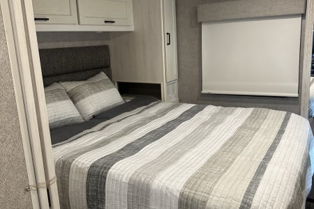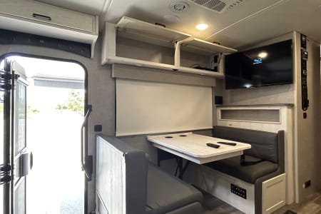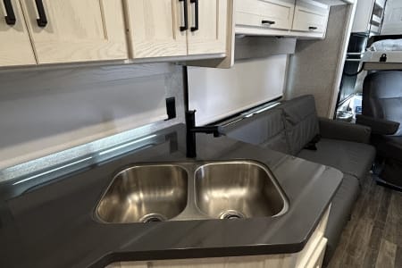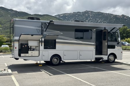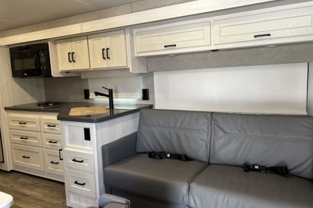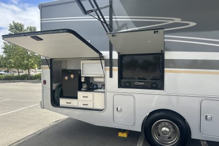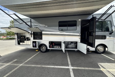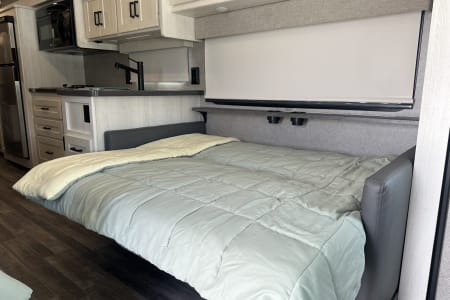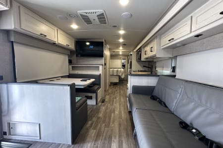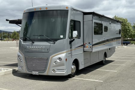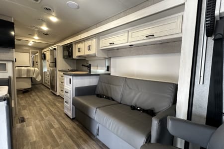 Wine, Dine, Relax and Unwind. Our Coach is your Home! This 30' Class A Coach is a perfect size and will get you into campgrounds most other Class A's wont fit. It has a spacious living room with large windows, big screen TV, and sofa. Front captain's chairs offer a panoramic view that swivel to join the living room space with an optional table. Above the driver's cabin is a drop-down bunk perfect for kiddos! As you move through the rig you will find a double-dinette perfect for eating or playing games! Across from the dinette is a peninsula kitchen with plenty of cabinets and drawers, stainless double sink, refrigerator, dual propane/induction cooktop, convection/microwave oven, and pantry. Winnie also features a nice bathroom with counter and cabinet space and a roomy skylight shower. Down the hall, you will find a spacious master bedroom with large closets, large drawers, over the bed storage and window ledges to hold your nighttime essentials. 120 VAC electrical outlets and 12 V USB outlets are available on each bedside and throughout the coach to conveniently charge your devices. If you like to lounge in bed to watch TV, you are in luck! Winnie comes equipped with a 28” Smart TV and Blu-ray player. Outside you will find a full-length awning, tv/radio/cd player, outdoor shower head, propane grill connection, outdoor kitchenette including sink, refrigerator and plenty of storage compartments. Our Coach has all you need for a luxurious glamping experience. Winnie is perfect for making memories with family and entertaining friends. Hope to see you soon!