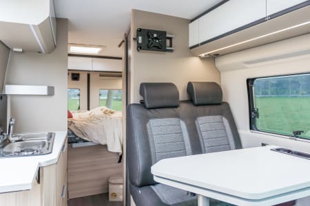 • Agencement intérieur optimisé : Profitez d'un espace de vie fonctionnel avec une cuisine équipée, des sièges convertibles en couchage, ainsi qu'un lit double spacieux pour deux personnes.