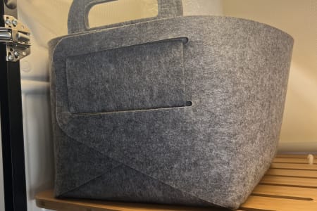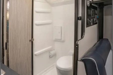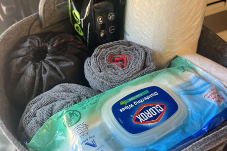 Full bathroom. So no need to worry about finding a spot in the woods. You get to choose between indoor or outdoor showers with hot water. You will find RV safe toilet paper (TIP: we only flush paper with #2 so the cassette needs to be dumped less often). The toilet has been prepared with RV pods to keep it clean & well managed. Extra toilet cassette pods are stored in the bathroom if needed when dumping the cassette. In the bathroom storage baskets you will also find microfiber fast drying bath towels, linen beach towels, trash can liners, and basic cleaning supplies.