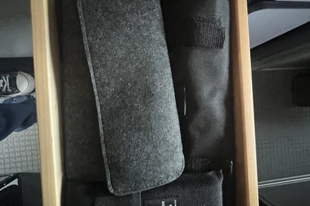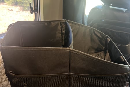 Shoe storage is provided with the THULE shoe organizer that hangs on the back of the passenger seat.