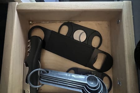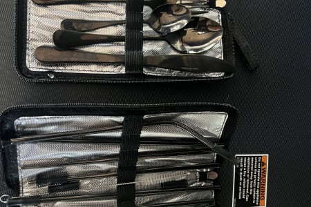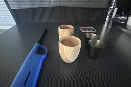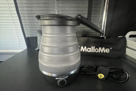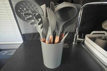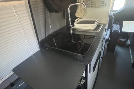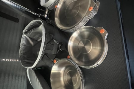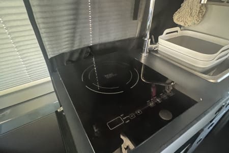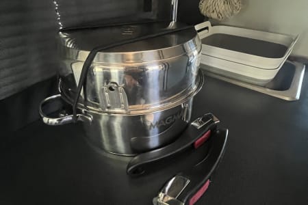 The kitchen is fully equipped with an induction burner cooktop, mini-fridge & freezer, and stainless steel sink & faucet. Make your morning coffee with the collapsable travel kettle and the aero press espresso and coffee maker. The kitchen can be used to cook any meal from simple to gourmet easily with the induction MAGMA-10 Piece Gourmet Nesting Stainless Steel Cookware Set, plus all of the cooking utensils & collapsible mixing bowls you will need to whip up a meal. We also include a Dash “Tasti-Crisp” 2.6 qt Air Fryer. Also included is a set of 12 different spices you can use. Enjoy your culinary masterpiece on a full set of top of the line Full Windsor 2.0 Magware- magnetic bowls, plates & cutlery set + DFACTO steak knife set.