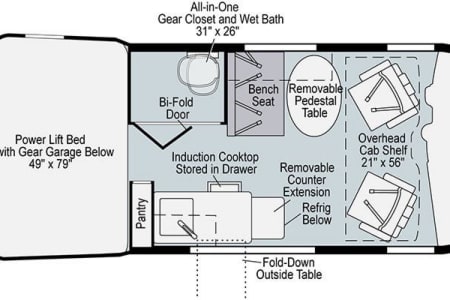 Storage- We’ve provided you with pull out storage cubes for the overhead cab shelf (we use them for our clothing) so you can keep the REVEL looking great for your pictures! You can fit approximately 2 carry-on suitcases of clothes without needing to store the pesky suitcase in the REVEL.