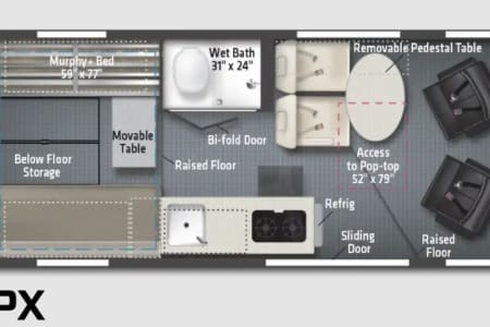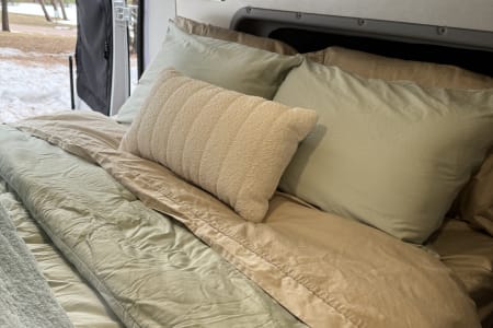 A home on wheels: a queen-sized Murphy bed awaits, complete with a 3-inch memory foam mattress topper for extra comfort for 2 adults. Pillows and the most comfortable linens are also included. Need more than one bed? No worries! The pop-up tent sleeping area comfortably fits 2 more people on a full-size mattress and you can add the option to use the pop top with bedding included through our "Add On" options.