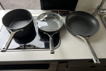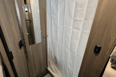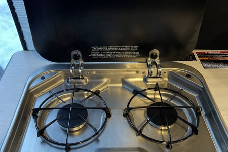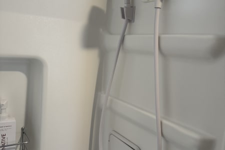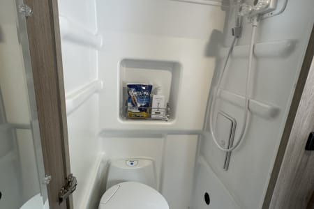 Convenience: There's no need to stop your adventures to find a bathroom – it's traveling with you! The van has a wet bath with a flushable cassette toilet and an indoor shower (yes, with hot water!). There's even an outdoor shower for those times you want to truly embrace nature. We provide fluffy towels and washcloths for your convenience.