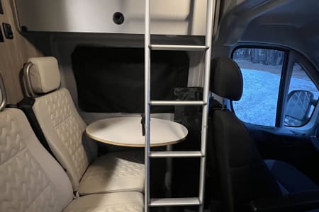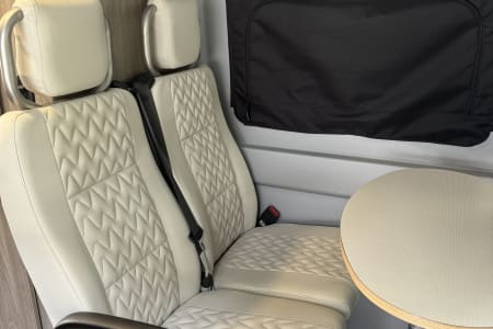 Don't worry about finding food, either. The fridge and ample storage spaces can hold enough food to feed your family for a week or two! The two-burner stovetop makes cooking a delight. The fridge and freezer will be ready for use, and kitchen cabinets are fully equipped with all the cooking utensils you could ever want. Think: plates, bowls, can openers, bottle openers, pots, pans, cups, cooking utensils, kitchen towels, and more! There's even an indoor dining table. The cab seats swivel to create seating for four inside the van. Yes, it's amazing!