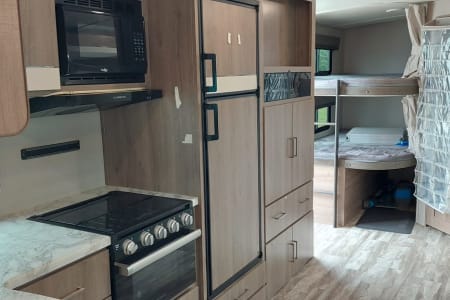 The Ideal Family Travel Trailer for your Vacation needs! Cruise easy with this lightweight 6500 pound travel trailer. Look out mountain bikers or cruisers, you can load an amazing 6 bikes on these professionally made bike racks. Sleep 8-10 persons comfortably and enjoy the large shower after a long day of camping activities. Rent today, and make this camping season the most memorable!