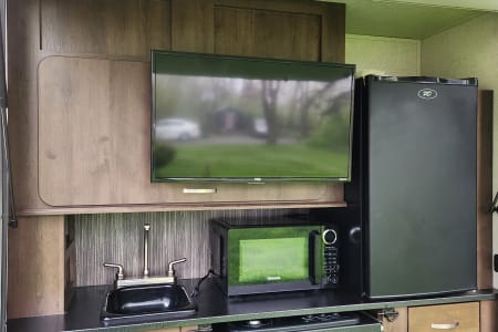 • Outdoor kitchen (32” smart TV, sink, mini fridge, 3 burner grill, toaster,).