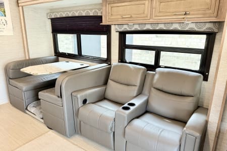 Behind the drivers area are two comfy recliners with cupholders- a delightfully comfortable space for putting your feet up after being on the road. Behind the recliners is a dinette area with under-seat storage. In addition to being used for meals and board games, this area can easily convert into a sleeping area.