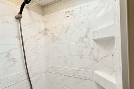 As you proceed further toward the back of the RV, you walk through the restroom area. On your left is the shower, and on your right is the toilet and sink area. If desired, the door to the restroom can be opened and latched in front of the shower area to create a privacy wall between the common area of the RV and bedroom area.
