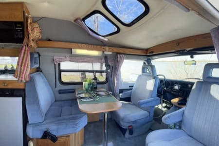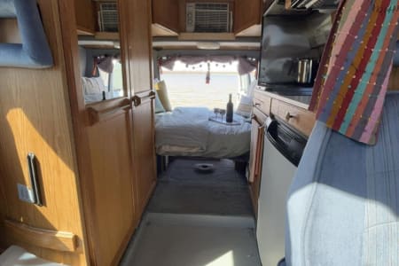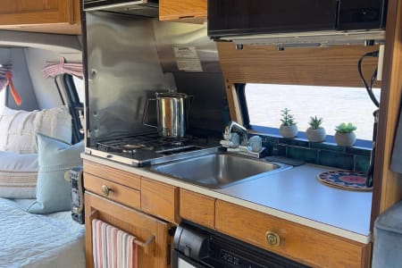 Propane and electric fridge. Round propane stoves, microwave oven.