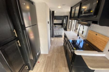 This Cherokee Grey Wolf travel trailer is grat for a couple's weekend excursions away from home. The large U-shaped dinette in the rear of the unit makes it easy to invite fellow campers in for an evening snack and a card game or two. It can also easily accommodate extra overnight guests as the dinette folds down to create additional sleeping space for two. The queen bed up front can be made a bit more private with the privacy curtain that can be pulled at night, and the full bath which is right across from the entry door is easily accessible from outside. There are plenty of storage options with the overhead cabinets, Fridge Freezer, pantry, and wardrobes inside, plus there is also outside storage!
