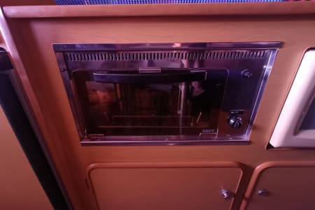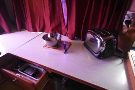 At 6.5 metres in overall length (plus extra for the bike carrier) this motorhome fits in a supermarket carpark assisted with its rear camera. The kitchen area is spacious compared with many larger campervans. We purposefully haven't compromised here, with plenty of pantry and food storage capacity, and trendy plates.