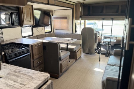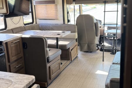 We have a KING Bed in the Master Bedroom, Full-size bed up top over the cab, two Pull-out Couches, and one Dinette Conversion bed.